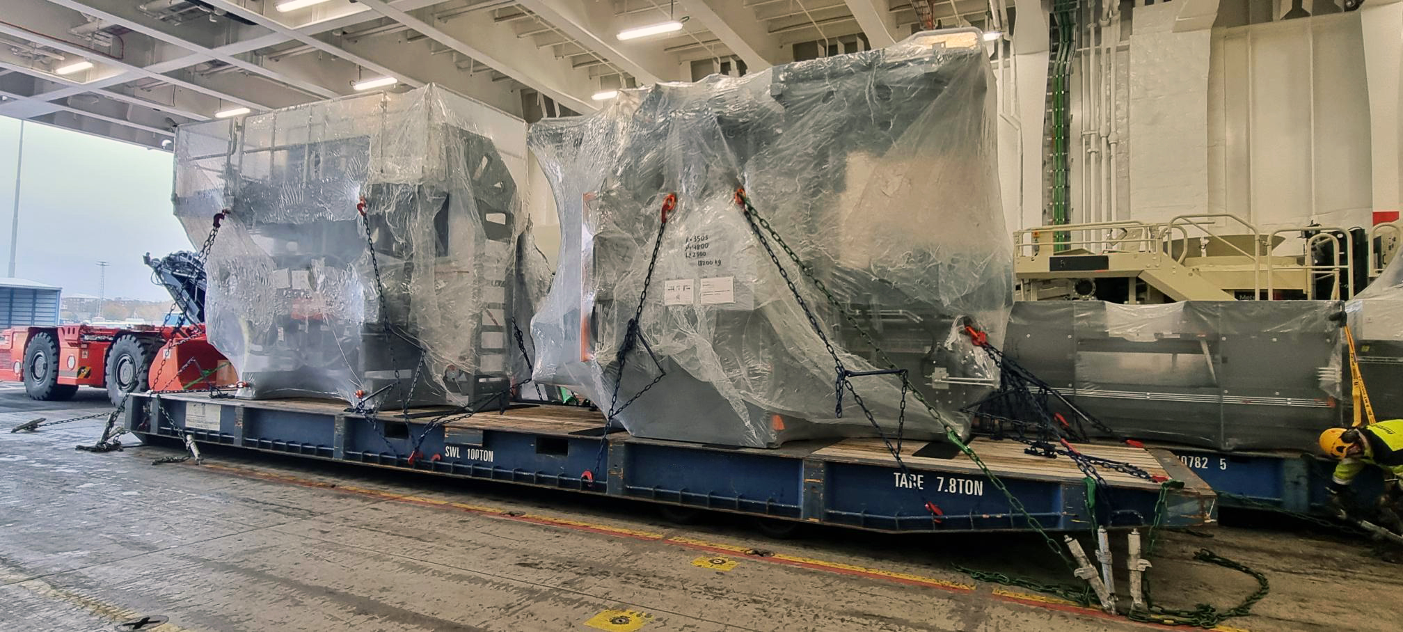 Ever wondered what oversized cargo looks like once secured inside a vessel? Here’s a glimpse from the hold, where Hacklin Logistics recently managed the transport of industrial units from Port of Turku to the U.S. The shipment included over-height conveyors measuring over 4 meters in height, up to 865 cm in length, and weighing 4,000 kg, all securely lashed onto MAFI trailers for a safe transatlantic journey.