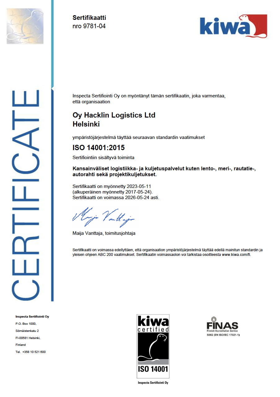 Hacklin Logistics, who recently joined the climate program of Keskuskauppakamari (Finland Chamber of Commerce) has received the Carbon Footprint Mark signifying that we are moving forward in our climate work towards sustainable green logistics by calculating the emissions of our operations using the international GHG Protocol.